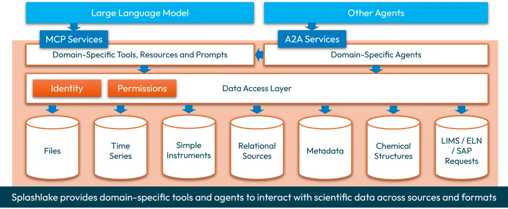 Splashlake offers a common way to access data across multiple source systems, without having to migrate. This offers a 360° view on experiments and their context. Permissions and identity ensure access control, even when using prompts. Exposing the data to large language models and AI agents leads to universal access to lab data.